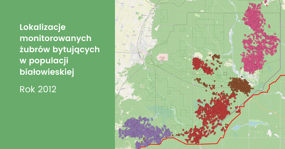 Na załączonych grafikach z lat 2012, 2014 i 2016 widać obszar przygraniczny w rejonie Puszczy Białowieskiej. Kolorowe markery naniesione na mapę to lokalizacje wyposażonych w obroże telemetryczne samic żubra, za którymi podążały stada. Sygnały satelitarne przekazywane były co jedną godzinę.