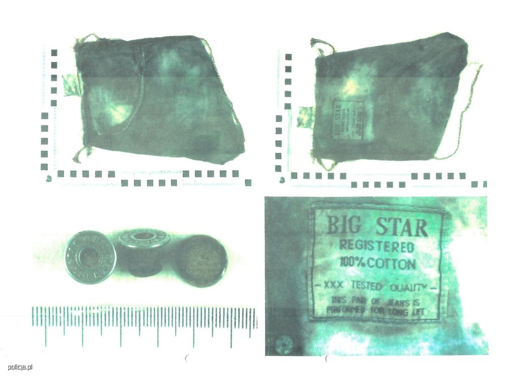 Przy zwłokach ujawniono resztki odzieży, tj. fragmenty spodni dżinsowych marki Big Star oraz koszulki Fruit of the Loom w rozmiarze XL.